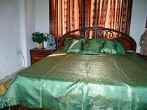 Product Description Gorgeous banarasi silks woven by mastercraftmen of Varanasi are used to make this bedding set.Beautifully adorned with elaborate golden brocade and Zari borders work these bring in an exotic ambiance.Update your bedroom decor with this elegant bedspread.