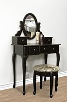 Product Description Best Choice Products is proud to present our brand new vanity table set. This stylish contemporary vanity table comes with swivel adjustable mirrors and 5 storage drawers. Its great for storing all your jewelry and smooth tabletop provides space for cosmetics and beauty supplies. It also includes a matching wooden stool with floral padded upholstered seat. This is sure to accent your bedroom. We purchase all of our products directly from the manufacturer, so you know youre getting the best prices possible NEW PRODUCT WITH FACTORY PACKAGING (not used or refurbished) FEATURES: Elegant and stylish black finish Adjustable oval wooden frame with mirror. 5 Storage drawers; great for storing jewelry. Smooth tabletop provides space for cosmetics and beauty supplies. Matching round stool with floral padded seat. Table dimensions: 32 x 16 x 51H Stool dimensions: 17"H x 16"W Some assembly required INCLUDES: (1) Vanity table (1) Adjustable mirror (5) St! orage drawers (1) Round stool